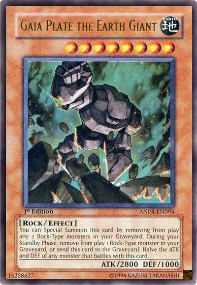 This card can be Special Summoned by removing from play 2 Rock-Type monsters in your Graveyard. The ATK and DEF of an opponent's monster that battles with this card are halved. During your Standby Phase, you must remove from play 1 Rock-Type monster from
