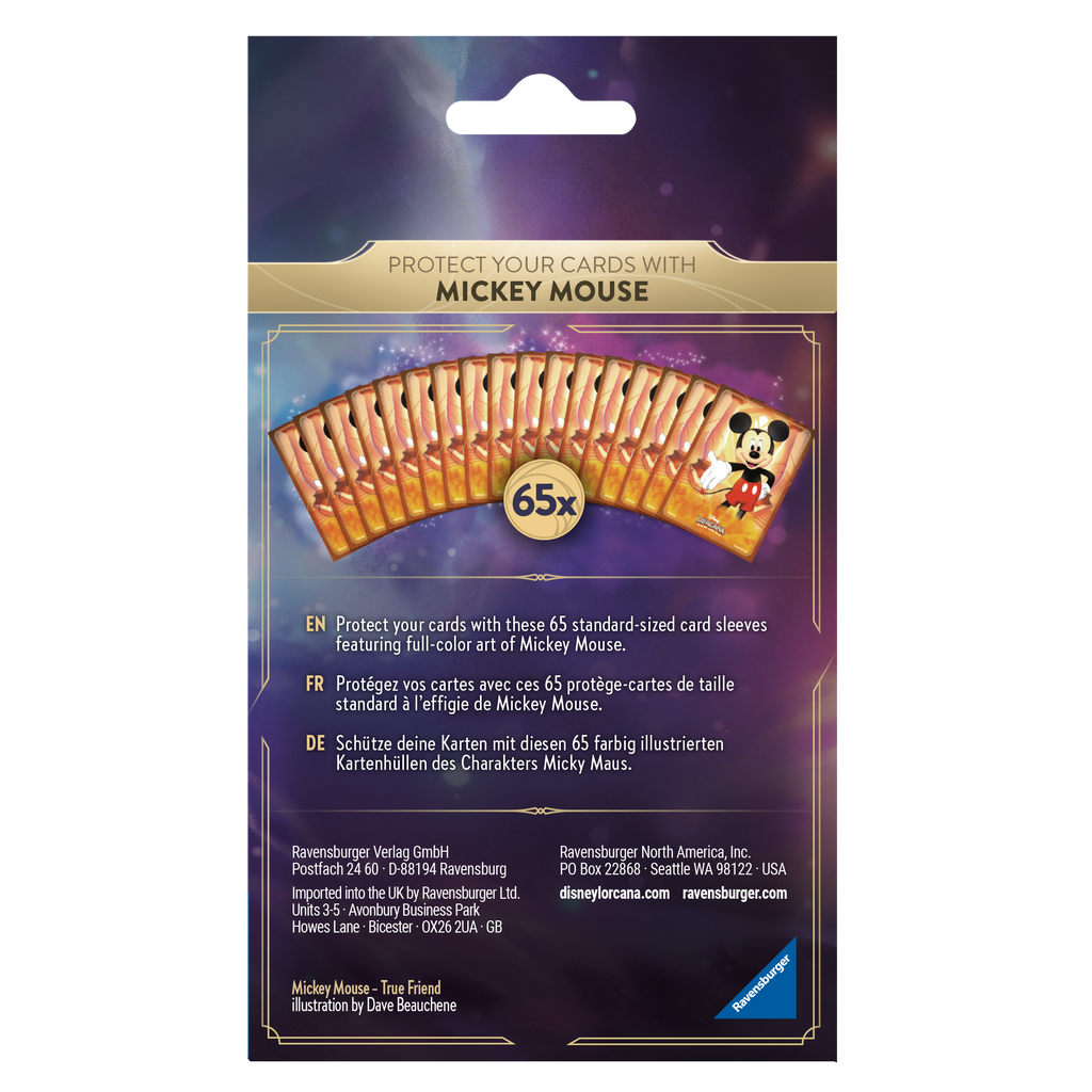 This set of 65 Disney Lorcana Card Sleeves has the print of the Disney character Mickey Mouse. These card sleeves are ideal for keeping your Disney Lorcana cards in top condition during and after playing. The card sleeves have a matte finish that makes shuffle easy and prevents reflection of light.